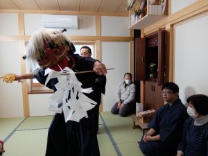 この写真は九日に招いた、旧大字南小高は、貴船神社の御神楽を、我が家での厄払いの舞です。